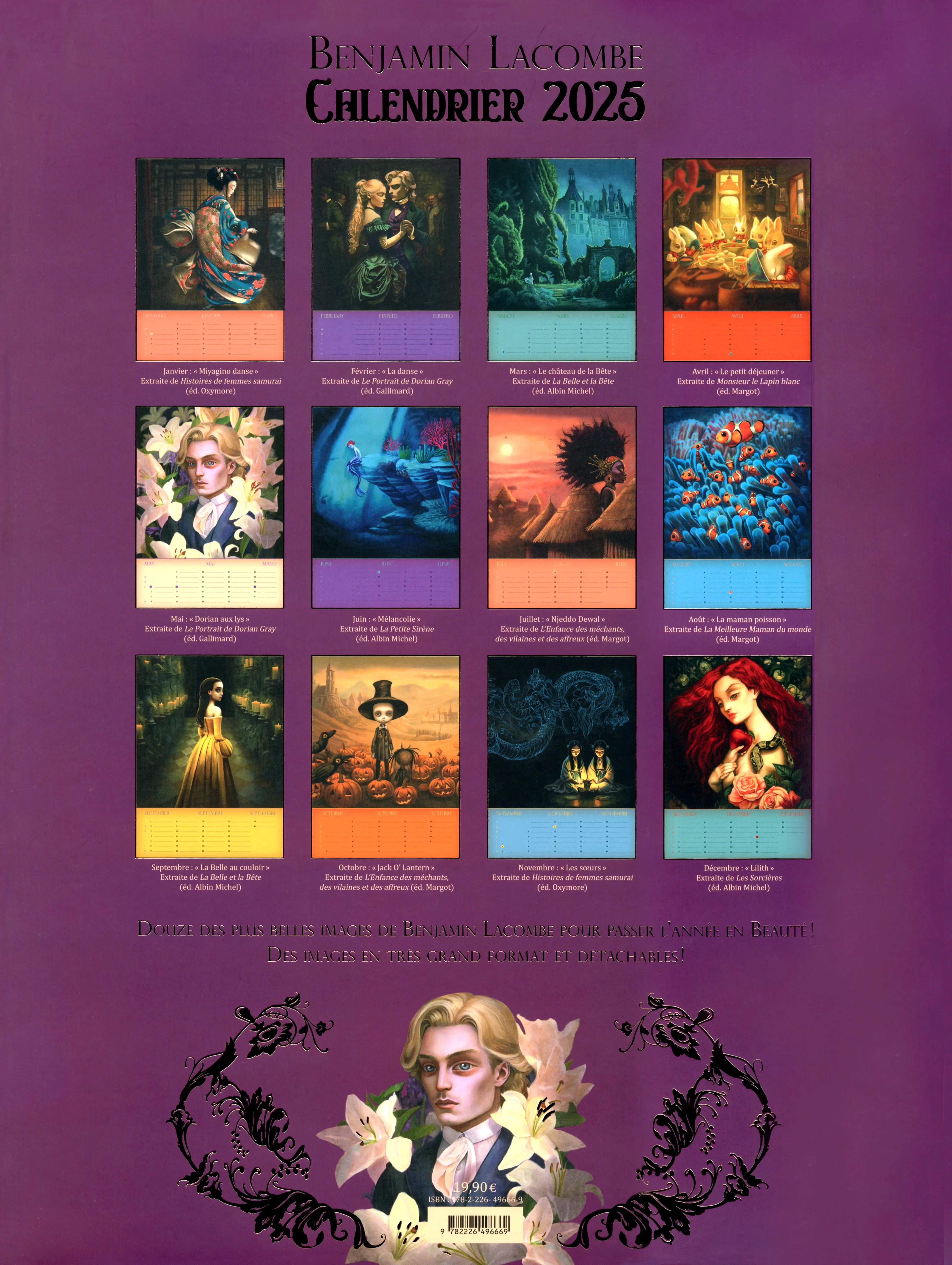 Découvrez le magnifique calendrier 2025 signé Benjamin Lacombe! Douze superbes illustrations pour passer l'année, en grand format et détachables, avec des incontournables mais aussi des inédits et des surprises tirés des livres de l'artiste (Histoires de femmes samourai, Le Portrait de Dorian Gray, La Belle et la Bête, Monsieur le Lapin Blanc, La Petite Sirène, L'Enfance des méchants, des vilaines et des affreux, La Meilleure Maman du monde et Les Sorcières.